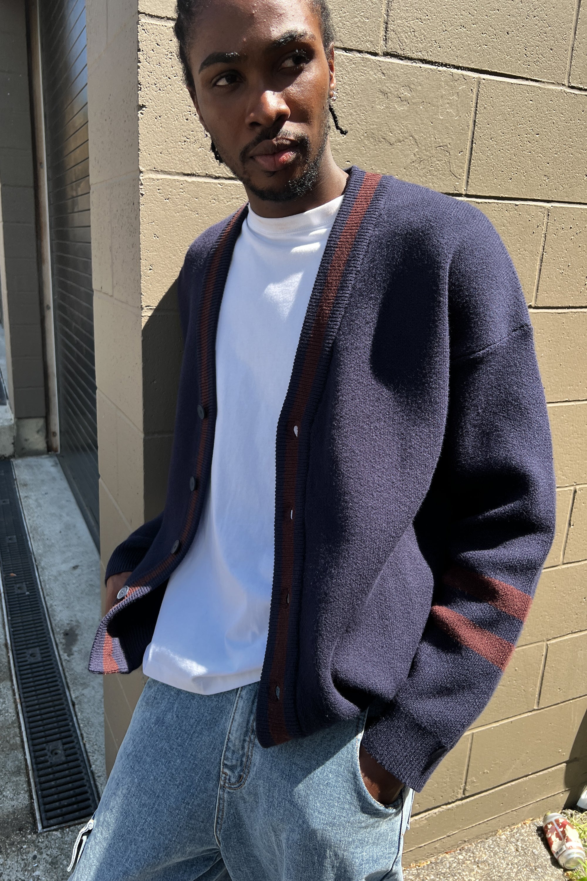 Relaxed fit. Button front. Ribbed trims. Contrast trims and sleeve stripes. 27" length based on size M.