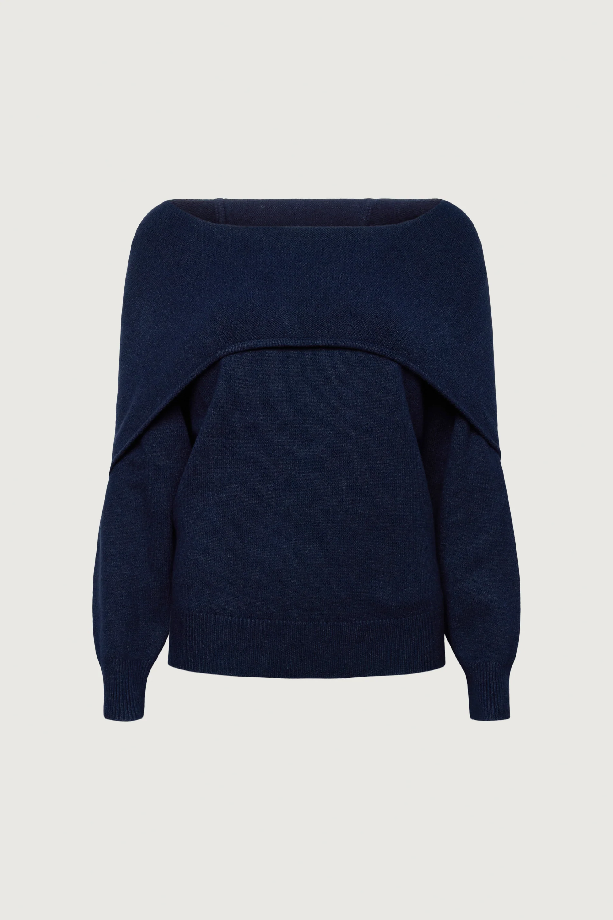 Knit fabric. Ribbed trims. Slouchy hoodie. Off the shoulder design.
