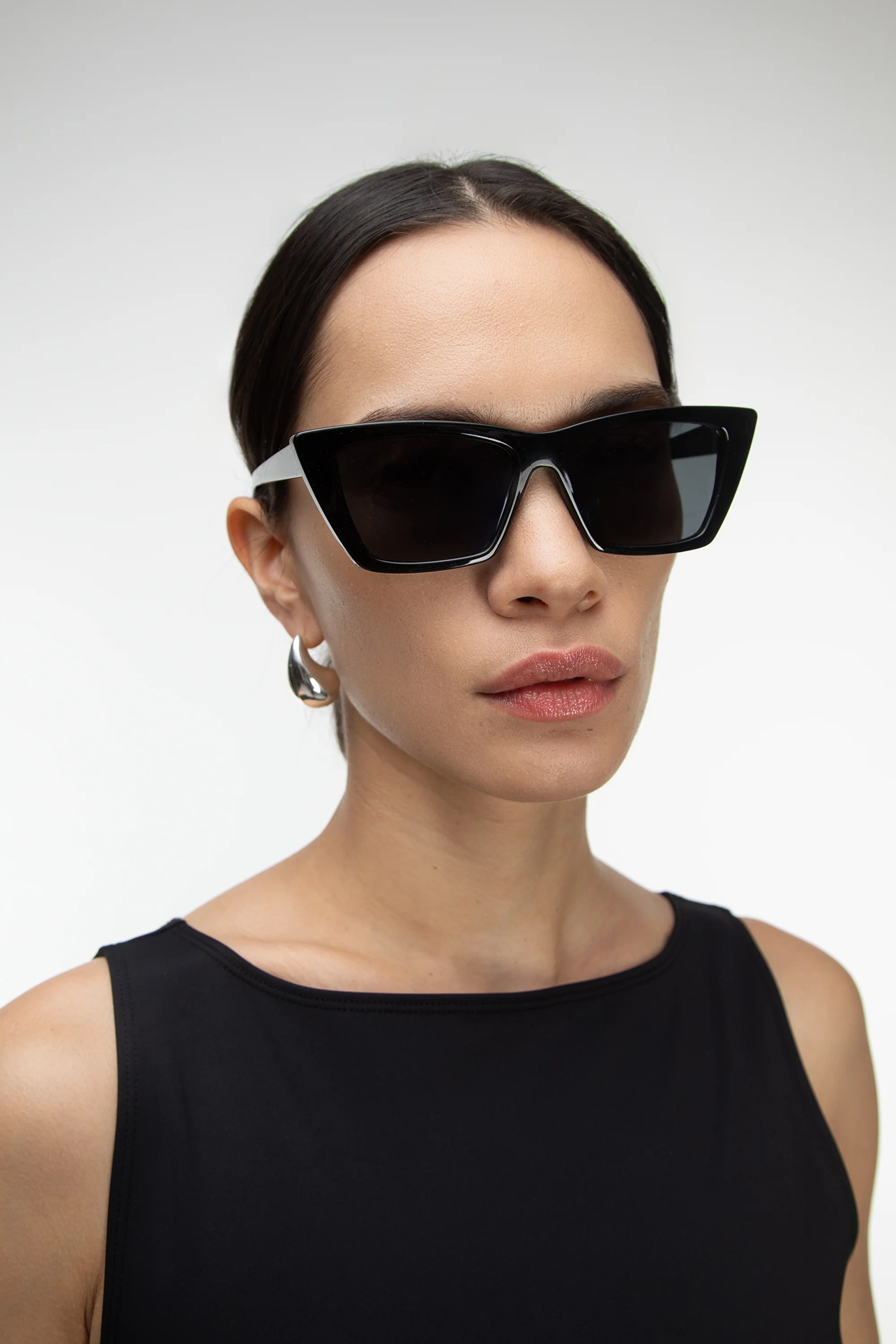 These sunglasses have a rectangular frame with pointed edges for a sleek touch. Versatile and effortless enough to pair with both casual and elevated outfits. Each pair comes with a complimentary case.