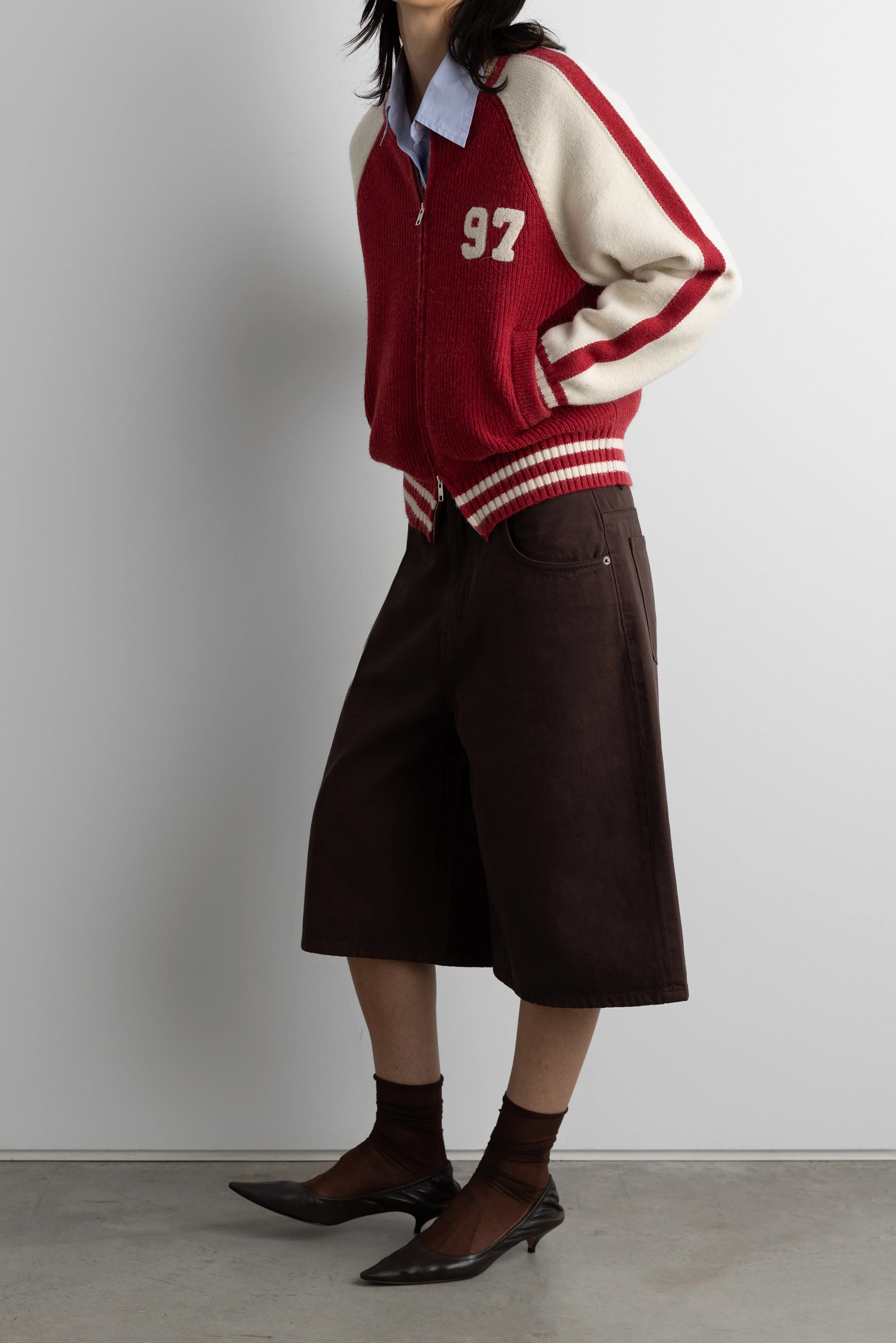 TWO TONE VARSITY ZIP-UP KNIT CARDIGAN